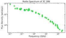 3C 286 is one of four primary calibrators used by the Very Large Array (along with 3C 48, 3C 138, and 3C 147). Visibilities of all other sources are calibrated using observed visibilities of one of these four calibrators.[12] It is an important calibrator for polarization measurements made by radio interferometers, because it has a relatively high degree of linear polarization (~10% at a wavelength of 20 cm, increasing to ~17% at 1.3 mm), and the angle of polarization does not change with time (although it is not independent of the wavelength observed).[13][14][15]