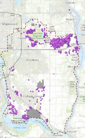The affected area is surrounded by both the Mississippi and St. Croix Rivers, contains Afton State Park, Lake Elmo Park Reserve, St. Croix Bluffs Regional Park, and Battle Creek Regional Park.[8]
