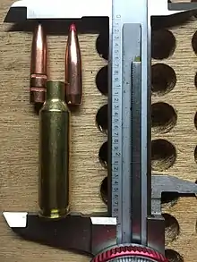 The longest 140gr bullets reach the neck-shoulder junction. Due to the relatively long neck, it can be reloaded with long target bullets without placing the base of the bullet below the neck. This eliminates the "donut" problem seen by many cases after being reloaded over 20 times. Left to right: a Remington 140gr and a 123gr A-Max. Calipers are set to magazine length.