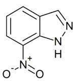 7-Nitroindazole, or 7-NI, is a heterocyclic small molecule containing an indazole ring that has been nitrated at the 7 position. Nitroindazole acts as a selective inhibitor for neuronal nitric oxide synthase, a hemoprotein enzyme that, in neuronal tissue, converts arginine to citrulline and nitric oxide (NO).[1] Nitric oxide can diffuse through the plasma membrane into neighbouring cells, allowing cell signalling, so nitroindazole indirectly inhibits this signalling process.[2][3][4] Other inhibitors exist such as 3-bromo-7-nitroindazole, which is more potent but less specific,[5] or NPA (N-propyl-L-arginine), which acts on a different site.[6]