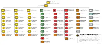 7th Division consists of a division headquarters, three tank regiments, one mechanized infantry regiment, one mechanized artillery regiment, one air defense regiment, one logistics support regiment and other support and service battalions and companies. In the field, the division task organizes these elements into combined arms "combat teams".[1] For example, attaching an infantry company, artillery battery, air defense battery and service units to a tank regiment to form a Tank Combat Team.[2]