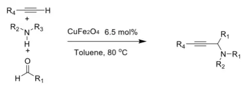 The reaction proceeds via direct dehydrative condensation[3] and requires a metal catalyst, typically based on ruthenium/copper, gold or silver.[3] Chiral catalyst can be used to give an enantioselective reaction, yielding a chiral amine. The solvent can be water.[3] In the catalytic cycle the metal activates the alkyne to a metal acetylide, the amine and aldehyde combine to form an imine which then reacts with the acetylide in a nucleophilic addition.[3] The reaction type was independently reported by three research groups in 2001 -2002;[6][7][8] one report on a similar reaction dates back to 1953.[9][10]