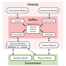 • Perceptual-motor modules, which take care of the interface with the real world (i.e., with a simulation of the real world). The most well-developed perceptual-motor modules in ACT-R are the visual and the manual modules.
