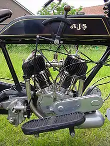 In 1905 the Stevens Motor Manufacturing Company built a V-twin motorcycle powered by a JA Prestwich Industries Ltd motor, with leading-link front forks and a swinging fork at the rear.[2] A new company, A J Stevens & Co (AJS), was founded in 1909 to manufacture motorcycles and at the 1912 London Motorcycle show they launched the 698cc side valve AJS Model D. Featuring cylinders at 50 degrees and chain drive to a three speed countershaft gearbox with a hand gear change, the original engines had quickly removable cylinder heads but after problems with oil leaks a more permanent head was specified for 1913.[1] The side valve engine was lubricated by a 'total loss' system operated by a hand pump. Ignition was achieved with a Splitdorf Magneto and the fuel system featured an Amac automatic carburettor. The silencer was made from cast aluminium and the frame was a tubular 'diamond' construction, with Brampton bi-flex front forks, which had an unusual two way movement, and quickly detachable wheels. The sidecar version of the Model D proved particularly successful and became so popular that AJS were not able to meet demand.[3]