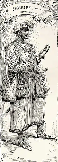 The fellowship catches up with the Sheriff. Robin stops the Sheriff, asking about the news from the King. Robin then quickly draws his bow, and lets loose an arrow that knocks the Sheriff off his horse. Before the Sheriff can rise, Robin beheads him with his sword. Lie there, proud Sheriff, taunts Robin, no man could trust you while you were alive.[2]:lines 1265-1412