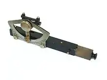 An Abney level and clinometer is an instrument used in surveying which consists of a fixed sighting tube, a movable spirit level that is connected to a pointing arm, and a protractor scale. An internal mirror allows the user to see the bubble in the level while sighting a distant target. It can be used as a hand-held instrument or mounted on a Jacob's staff for more precise measurement, and it is small enough to carry in a coat pocket.[1][2]