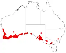 It is found along coastal areas in the Mid West, Wheatbelt, Peel, South West, Great Southern and Goldfields-Esperance region of Western Australia from Geraldton in the north, to Augusta in the south and east to the South Australian border. It is found in limestone areas and on and around sand dunes growing in sandy soils.[1] In South Australia it is also found to have a discontinuous distribution from the border eastwards to around Yorketown and Yorke Peninsula and on Kangaroo Island. It is often part of coastal heath or scrubland communities in sandy or loamy soils.[5]