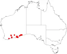 It has a scattered and disjunct distribution to an area in the Goldfields-Esperance, Wheatbelt and Great Southern regions of Western Australia between Albany in the west, Kondinin in the north and Cocklebiddy in the east. It is found on the plains where it grows in loamy or sandy clay soils over limestone.[2]