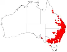 It is widespread in eastern Australia from central coastal Queensland to southern Victoria, with outlying populations on the Atherton Tableland in northern Queensland and Tasmania's King Island.[1] The tree is commonly found on fertile plains and in hilly country it is usually part of open forest communities and grows in shallow drier sandy and clay soils.[5]