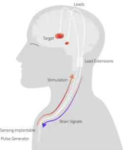 Conventional DBS delivers constant electrical stimulation to regions of the brain that control movement through a surgically implanted wire, or lead, that is connected to an implantable pulse generator (IPG). Programming adjustments to the pulse generator are frequently made by the treating neurologist based on what the patient is doing and the medication they take over time to optimize the patient's symptoms.[2] However, it can lead to side effects.[3] Developed by Alberto Priori in 2005, aDBS is a specific type of closed-loop DBS and differs from conventional DBS systems (that provide constant stimulation) in that it can both sense the brain activity and deliver the appropriate stimulation in real time. This technology has been licensed and is developed by Newronika,[4][5]