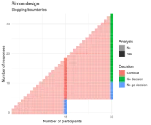 For trials with a binary (response/no response) outcome and a single treatment arm, a popular and simple group sequential design with two stages is the Simon design. In this design, there is a single interim analysis partway through the trial, at which point the trial either stops for futility or continues to the second stage.[20] Mander and Thomson also proposed a design with a single interim analysis, at which point the trial could stop for either futility or benefit.[21]