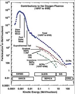 Figure 1 shows the particle fluence (total flux over a given period of time) of oxygen at ACE for a time period just after solar minimum, the part of the 11-year solar cycle when solar activity is lowest.[18] The lowest-energy particles come from the slow and fast solar wind, with speeds from about 300 to about 800 km/s. Like the solar wind distribution of all ions, that of oxygen has a suprathermal tail of higher-energy particles; that is, in the frame of the bulk solar wind, the plasma has an energy distribution that is approximately a thermal distribution but has a notable excess above about 5 keV, as shown in Figure 1. The ACE team has made contributions to understanding the origins of these tails and their role in injecting particles into additional acceleration processes.