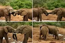 Africa bush elephants use their trunks for tactile communication. When greeting, a lower ranking individual will insert the tip of its trunk into its superior's mouth. Elephants will also stretch out their trunk toward an approaching individual they intend to greet. Mother elephants reassure their young with touches, embraces, and rubbings with the foot while slapping disciplines them. During courtship, a couple will caress and intertwine with their trunks while playing and fighting individuals wrestle with them.[39]