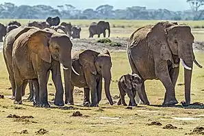 The core of elephant society is the family unit, which mostly comprises several adult cows, their daughters, and their prepubertal sons. Iain Douglas-Hamilton, who observed African bush elephants for 4.5 years in Lake Manyara National Park, coined the term 'kinship group' for two or more family units that have close ties. The family unit is led by a matriarch who at times also leads the kinship group.[26][27] Groups cooperate in locating food and water, in self-defense, and in caring for offspring (termed allomothering).[26] Group size varies seasonally and between locations. In Tsavo East and Tsavo West National Parks, groups are bigger in the rainy season and areas with open vegetation.[28] Aerial surveys in the late 1960s to early 1970s revealed an average group size of 6.3 individuals in Uganda's Rwenzori National Park and 28.8 individuals in Chambura Game Reserve. In both sites, elephants aggregated during the wet season, whereas groups were smaller in the dry season.[29]