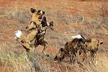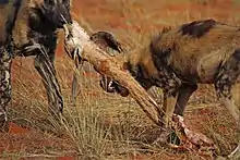 The species is a specialised diurnal hunter of terrestrial ungulates, which it captures by using its stamina and cooperative hunting to exhaust them. Its natural competitors are lions and spotted hyenas: the former will kill the dogs where possible whilst the latter are frequent kleptoparasites.[4] Like other canids, the African wild dog regurgitates food for its young but also extends this action to adults as a central part of the pack's social unit.[5][4][6] The young have the privilege of feeding first on carcasses.