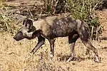 The fur of the African wild dog differs significantly from that of other canids, consisting entirely of stiff bristle-hairs with no underfur.[36] Adults gradually lose their fur as it ages, with older individuals being almost naked.[40] Colour variation is extreme, and may serve in visual identification, as African wild dogs can recognise each other at distances of 50–100 m (160–330 ft).[39] Some geographic variation is seen in coat colour, with northeastern African specimens tending to be predominantly black with small white and yellow patches, while southern African ones are more brightly coloured, sporting a mix of brown, black and white coats.[7] Much of the species' coat patterning occurs on the trunk and legs. Little variation in facial markings occurs, with the muzzle being black, gradually shading into brown on the cheeks and forehead. A black line extends up the forehead, turning blackish-brown on the back of the ears. A few specimens sport a brown teardrop-shaped mark below the eyes. The back of the head and neck are either brown or yellow. A white patch occasionally occurs behind the fore legs, with some specimens having completely white fore legs, chests and throats. The tail is usually white at the tip, black in the middle and brown at the base. Some specimens lack the white tip entirely, or may have black fur below the white tip. These coat patterns can be asymmetrical, with the left side of the body often having different markings from the right.[39]