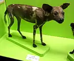 The oldest African wild dog fossil dates back to 200,000 years ago and was found in HaYonim Cave, Israel.[20][1] The evolution of the African wild dog is poorly understood owing to the scarcity of fossil finds. Some authors consider the extinct Canis subgenus Xenocyon as ancestral to both the genus Lycaon and the genus Cuon,[21][22][23][24]:p149 which lived throughout Eurasia and Africa from the Early Pleistocene to the early Middle Pleistocene. Others propose that Xenocyon should be reclassified as Lycaon.[1] The species Canis (Xenocyon) falconeri shared the African wild dog's absent first metacarpal (dewclaw), though its dentition was still relatively unspecialised.[1] This connection was rejected by one author because C. (X.) falconeri's lack of the first metacarpal is a poor indication of phylogenetic closeness to the African wild dog, and the dentition was too different to imply ancestry.[25]