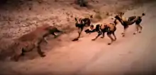 Lions dominate African wild dogs and are a major source of mortality for both adults and pups.[74] Population densities are usually low in areas where lions are more abundant.[75] One pack reintroduced into Etosha National Park was wiped out by lions. A population crash in lions in the Ngorongoro Conservation Area during the 1960s resulted in an increase in African wild dog sightings, only for their numbers to decline once the lions recovered.[74] As with other large predators killed by lion prides, the dogs are usually killed and left uneaten by the lions, indicating the competitive rather than predatory nature of the lions' dominance.[76][77] However, a few cases have been reported of old and wounded lions falling prey to African wild dogs.[78][79] On occasion, packs of wild dogs have been observed defending pack members attacked by single lions, sometimes successfully. One pack in the Okavango in March 2016 was photographed by safari guides waging "an incredible fight" against a lioness that attacked a subadult dog at an impala kill, which forced the lioness to retreat, although the subadult dog died. A pack of four wild dogs was observed furiously defending an old adult male dog from a male lion that attacked it at a kill; the dog survived and rejoined the pack.[80]