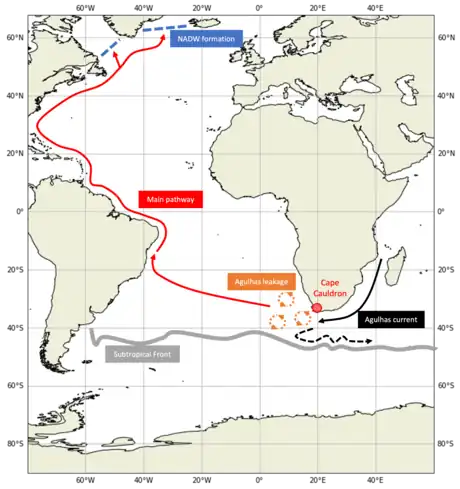 The Agulhas Leakage is an inflow of anomalously warm and saline water from the Indian Ocean into the South Atlantic due to the limited latitudinal extent of the African continent compared to the southern extension of the subtropical super gyre in the Indian Ocean.[1] The process occurs during the retroflection of the Agulhas Current via shedding of anticyclonic Agulhas Rings, cyclonic eddies and direct inflow. The leakage contributes to the Atlantic Meridional Overturning Circulation (AMOC) by supplying its upper limb, which has direct climate implications.[2]