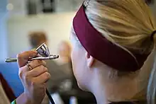 Airbrush makeup is makeup sprayed onto the skin using an airbrush machine instead of being applied with sponges, brushes, fingers, or other methods.[1] A typical airbrush system uses a compressor to create airflow through a hose connected to a trigger-controlled spray painting gun. The airbrush pressure can be adjusted to apply various types of makeup, such as lighter, heavier, or more detailed styles. Airbrushes are used in film, theater, bridal makeup, and sunless tanning. Airbrush systems designed for personal, in-home use are usually smaller and work at a lower pressure than systems used in professional applications.