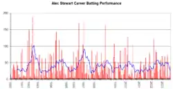 Stewart's batting average (39.54) is the lowest of any player to have scored 8000 or more runs in Test cricket: he is the only player to have scored over 8000 runs despite an average of under 40.[4] However, when played as a specialist batsman in Test cricket, Stewart averaged 46.90 in 51 games with 9 centuries. Since World War II, only Len Hutton, Geoff Boycott, Dennis Amiss and Alastair Cook have bettered Stewart's average of 46 as a specialist opening batsman for England.[5] As wicketkeeper-batsman he averaged 34.92 from 82 tests, higher than many of his contemporaries. He was unlucky enough to be on the losing side in a record 54 Test Matches.