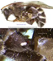 | Male bee. The lower frame is a blow-up of the small rectangle in the upper frame, showing a Sancassania boharti parasitizing him. | |