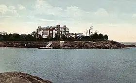 The expansive brick home was built in the late 1800s for Charles Oliver Iselin, son of wealthy Wall Street financier and railroad magnate Adrian G Iselin. C. Oliver was one of the most famous yachtsmen of the time and a five-time defender of the America's cup.[2] He built a breakwater in Echo Bay so that he could safely dock his yachts including the Vigilant, Defender and Columbia next to his home.[3][4][5] Iselin's second wife Hope Goddard Iselin was the first woman to serve as part of the crew on an America's Cup yacht. Iselin hosted many of the most prominent members of society at the home including the Vanderbilts and Morgans, as well as dignitaries and royalty.[6]