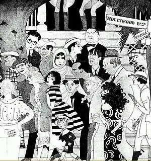 This 1922 Vanity Fair caricature by Ralph Barton[18] shows the famous people whom, he imagined, left work each day in Hollywood; use cursor to identify individual figures.