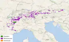 The Alpine ibex is native to the Alps, its range including France, Switzerland, Liechtenstein, Italy, Germany and Austria.[9] Fossils of the species have been found as far south as Greece, where they went extinct due to hunting over 7,500 years ago.[10] Between the 16th and 18th centuries, the species disappeared from much of its range due to hunting, leaving only one population surviving in and around Gran Paradiso by the 19th century. They have since been reintroduced into parts of their former range,[9] as well as new areas such as Slovenia[11] and Bulgaria.[9]