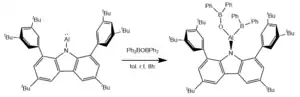 In 2023, Liu and coworkers published further examples of the reactivity of their N-aluminylene as they attempted to react the compound with various boron based Lewis acids.  Upon reaction with Ph2BOBPh2, the aluminylene formed a tricoordinate species featuring new aluminium-boron and aluminium-oxygen bonds.  This free alumaborane was characterized via 11B NMR and showed two three-coordinate boron atoms, an observation further supported by x-ray crystallography data.  The formation of Lewis adducts was also observed when the aluminylene was mixed with strong Lewis acids such as BCF (Tris(pentafluorophenyl)borane) and Piers’ borane (HB(C6F5)2).[13][14]