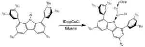 The N-aluminylene reported by Liu and coworkers was shown to undergo an oxidative insertion reaction when mixed with IDippCuCl (IDipp=1,3-bis(2,6-diisopropylphenyl)imidazol-2-ylidene) to form a terminal copper-alumanyl complex.[8]