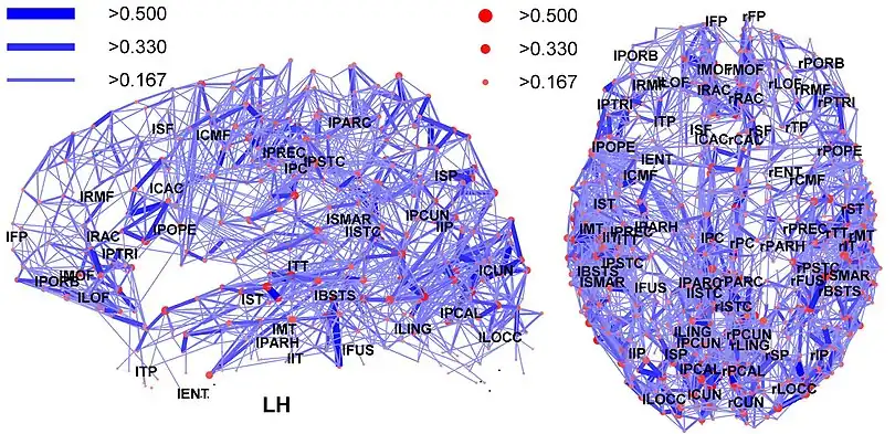 Figure 5. Network representation of brain connectivity. The thickness of the lines represent the strength of connection between different brain areas. Important 'hubs' are marked as circles. As Alzheimer's disease progresses, individual connections erode.[23]- Many genes in addition to APOE ε4 underlie late onset AD. ADNI data has helped to identify or confirm 10 of the approximately 20 risk genes currently identified[24][25]