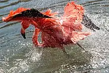 The American flamingo has adapted to its shallow-water environment in several ways. It has evolved long legs and large webbed feet to wade and stir up the bottom of the water bed to bring up their food source to then be retrieved. To feed, it has evolved a specialized beak which is hooked downward and features marginal lamellae on the upper mandible, and inner and outer lamellae on both the upper and lower mandibles. These are adapted for filtering out differently sized food from water.[20] Depending on the food source in their area, diets depend on the exact morphology of their beaks on what can and cannot be strained out of them. The American flamingo's diet consists of small crustaceans, molluscs, some worms, nematodes, insects and their larvae, small fish, widgeon grass, seeds and algae.[21][22] They are also known to consume mud from which they are able to get microorganisms and bacteria and obtain nutrients.[21][22] It submerges its head under water to retrieve its food, and may have its head under water for long times, which requires it to hold its breath. Factors which affect the habitat choice of American flamingos are environmental temperatures, water depth, food source, accessibility of an area, and the presence of vegetation beds in feeding areas. If available food items do not meet the needs of the flamingos or the temperature is not appropriate to their requirements, they move to a better feeding or more temperate area.