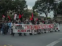 The Direct Action Movement was formed in 1979 when the remaining SWF branch and other smaller anarchist groups decided to form a new organisation of anarcho-syndicalists in Britain.[45] The DAM was highly involved in the Miners' Strike and a series of industrial disputes later in the 1980s, including the Ardbride dispute in Ardrossan, Scotland, involving a supplier to Laura Ashley, for which the DAM received international support. From 1988 in Scotland, then England and Wales, the DAM was active in opposing the Poll Tax.[46] In March 1994, DAM changed to its current name, the Solidarity Federation, having been the Direct Action Movement since 1979 and the Syndicalist Workers' Federation since 1950. The Solidarity Federation publishes the quarterly magazine Direct Action (presently on hiatus) and the newspaper Catalyst.[47] In 1979, a split over representative unionism, professional unionism and state-funded schemes saw the CNT divided into two sections, the CNT as it is today and the Confederacion General del Trabajo. After Franco's death in November 1975 and the beginning of Spain's transition to democracy, the CNT was the only social movement to refuse to sign the 1977 Moncloa Pact,[48] an agreement amongst politicians, political parties and trade unions to plan how to operate the economy during the transition. In 1979, the CNT held its first congress since 1936 and several mass meetings, the most remarkable one in Montjuïc. Views put forward in this congress would set the pattern for the CNT's line of action for the following decades: no participation in union elections, no acceptance of state subsidies,[49] no acknowledgement of works councils and support of union sections.