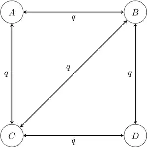 Example of a four-state 1-parameter Markov chain model. Note that in this diagram, transitions between states A and D have been disallowed; it is conventional to not draw the arrow rather than to draw it with a rate of 0. - Asymmetrical Markov -state 2 parameter model: in this model, the state space is ordered (so that, for example, state 1 is smaller than state 2, which is smaller than state 3), and transitions may only occur between adjacent states. This model contains two parameters and : one for the rate of increase of state (e.g. 0 to 1, 1 to 2, etc.), and one for the rate of decrease in state (e.g. from 2 to 1, 1 to 0, etc.).