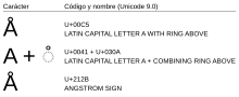 For compatibility reasons, Unicode includes the formal symbol U+212B ANGSTROM SIGN (HTML entity Å, Å, or Å), which is deprecated.[26] The angstrom sign is normalized into U+00C5 Å LATIN CAPITAL LETTER A WITH RING ABOVE (HTML entity Å, Å, or Å).[27] The Unicode consortium recommends to use the latter.[26]
