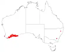 The plant is often situated in seasonally wet areas growing in sandy soils along the south coast from around Albany in the west to around Cape Arid in the east.[2]