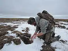 Wildlife Services (WS) field specialist sets a fox trap at the Barrow Steller's Eider Conservation Area in Alaska
