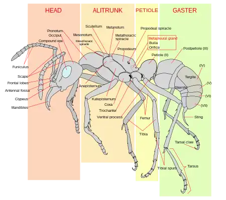 Ants are distinct in their morphology from other insects in having geniculate (elbowed) antennae, metapleural glands, and a strong constriction of their second abdominal segment into a node-like petiole. The head, mesosoma, and metasoma are the three distinct body segments (formally tagmata). The petiole forms a narrow waist between their mesosoma (thorax plus the first abdominal segment, which is fused to it) and gaster (abdomen less the abdominal segments in the petiole). The petiole may be formed by one or two nodes (the second alone, or the second and third abdominal segments).[36] Tergosternal fusion, when the tergite and sternite of a segment fuse together, can occur partly or fully on the second, third and fourth abdominal segment and is used in identification. Fourth abdominal tergosternal fusion was formerly used as character that defined the poneromorph subfamilies, Ponerinae and relatives within their clade, but this is no longer considered a synapomorphic character.[37]