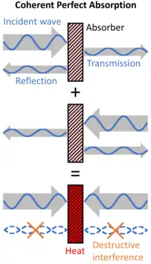 A coherent perfect absorber (CPA), or anti-laser, is a device which absorbs coherent waves, such as coherent light waves, and converts them into some form of internal energy, e.g. heat or electrical energy.[1][2] It is the time-reversed counterpart of a laser.[3] Coherent perfect absorption allows control of waves with waves (light with light) without a nonlinear medium. The concept was first published in the July 26, 2010, issue of Physical Review Letters, by a team at Yale University led by theorist A. Douglas Stone and experimental physicist Hui W. Cao.[4][5] In the September 9, 2010, issue of Physical Review A, Stefano Longhi of Polytechnic University of Milan showed how to combine a laser and an anti-laser in a single device.[6] In February 2011 the team at Yale built the first working anti-laser.[7][8] It is a two-channel CPA device which absorbs two beams from the same laser, but only when the beams have the correct phases and amplitudes.[9] The initial device absorbed 99.4 percent of all incoming light, but the team behind the invention believe it will be possible to achieve 99.999 percent.[7] Originally implemented as a Fabry-Pérot cavity that is many wavelengths thick, the optical CPA operates at specific optical frequencies. In January 2012, thin-film CPA has been proposed by utilizing the achromatic dispersion of metal-like materials, exhibiting the unparalleled bandwidth and thin profile advantages.[10] Shortly after, CPA was observed in various thin film materials, including photonic metamaterial,[11] multi-layer graphene,[12] single[13] and multiple[14] layers of chromium, as well as microwave metamaterial.[15]
