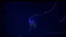 In the ocean, the aphotic zone is sometimes referred to as the dark ocean. Depending on how it is defined, the aphotic zone of the ocean begins between depths of about 200 m (660 ft) to 800 m (2,600 ft) and extends to the ocean floor.[1][2][3] The majority of the ocean is aphotic, with the average depth of the sea being 4,267 m (13,999 ft) deep with the deepest part of the sea, being the Challenger Deep in the Mariana Trench, is about 11,000 m (36,000 ft) deep. The depth at which the aphotic zone begins in the ocean depends on many factors. In clear, tropical water sunlight can penetrate deeper and so the aphotic zone starts at greater depths. Around the poles, the angle of the sunlight means it does not penetrate as deeply so the aphotic zone is shallower. If the water is turbid, suspended material can block light from penetrating, resulting in a shallower aphotic zone.[4] Temperatures can range from roughly 0 °C (32 °F) to 6 °C (43 °F).