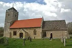 The oldest parts of the Church of England parish church of Saint Laurence are 12th-century[2] Norman. The north aisle was added late in that century, linked with the nave by a four-bay arcade of pointed arches. In the 13th century a new window and doorway were inserted in the south wall of the nave, as was the priest's doorway on the south side of the chancel. The east window of the chancel is 14th-century in style. In the 15th century the Perpendicular Gothic[3] bell tower was added, a window inserted on the south side of the nave and the nave was re-roofed. The south porch was added early in the 16th century, the north aisle was rebuilt in the 17th century and the north porch was built in about 1700. The Gothic Revival architect CC Rolfe restored the nave in 1882–84.[5] The church is a Grade II* listed building.[2][3][6]
