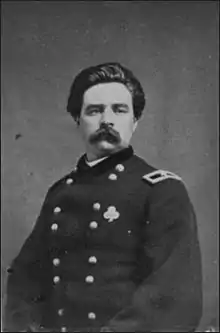 At about 5 p.m., on March 29, two of Sheridan's divisions, the First commanded by Brigadier General Thomas Devin and, the Second, detached from the Army of the Potomac, commanded by Major General George Crook entered Dinwiddie Court House.[47] Sheridan posted guards at the roads entering the town for protection from Confederate patrols.[47] Sheridan's Third Division commanded by Brigadier General (Brevet Major General) George Armstrong Custer was 7 miles (11 km) behind Sheridan's main force protecting the bogged down wagon trains.[47][83] The First and Third Divisions were still under the direct command of Brigadier General (Brevet Major General) Wesley Merritt as an unofficial cavalry corps commander of the still existing Army of the Shenandoah.[48]