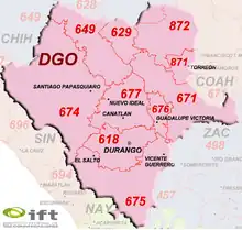 Area code 674 serves several municipalities in the western highlands in the State of Durango. The area code was created in 2002 as a result of the consolidation of location specific area codes 181, 182 and 183. The local area code went from 186 and 187 to 1, at the same time, the local number length increased from 5 to 7 digits. In the process, the area code went from designating a city or town to designating a geographical area. The 674 area code is centered in Santiago Papasquiaro. The original code for the city of Santiago Papasquiaro was 186. A total of 206,286 numbers have been assigned to this area code as of November 2018.