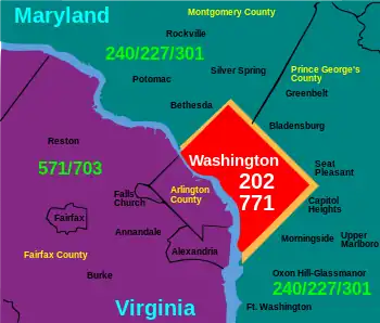 Areas such as Alexandria, Arlington,[12] Fairfax,[13] Falls Church, McLean and Tysons in Virginia[14] (Area codes 703 and 571) and Rockville,[15] Gaithersburg,[16] Upper Marlboro,[17] Bethesda[18] and Landover in Maryland[19] (Area codes 301 and 240) are a local call to Washington.