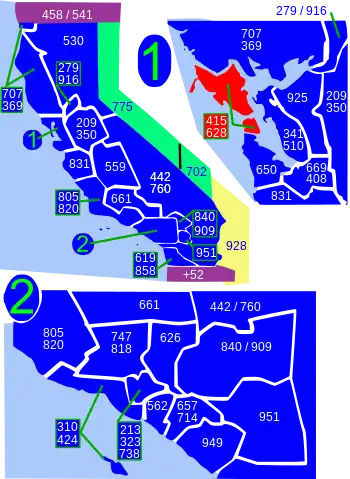 California area codes: 209, 213/323, 279/916, 310/424, 341/510, 408/669, 415/628, 442/760, 530, 559, 562, 619/858, 626, 650, 657/714, 661, 707, 747/818, 805/820, 831, 840/909, 925, 949, 951