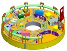 The upper-stage simulator (USS) was manufactured by NASA personnel at Glenn Research Center in Cleveland.[9] Because of transportation limitations (bridge heights on highways and rivers), the simulator was built out of eleven steel segments 9.5 feet (2.9 m) tall by 18 feet (5.5 m) wide. The USS simulated the shape, mass, and center of gravity characteristics of Ares I from the interstage to the top of the service module of the Orion Crew exploration vehicle. The centers of mass for the liquid hydrogen and liquid oxygen tanks were simulated through the use of steel ballast plates.[6]:7