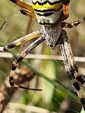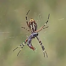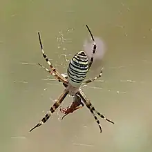 Argiope bruennichi (wasp spider) is a species of orb-web spiders distributed throughout Central and Northern Europe, North Africa, parts of Asia, and the Azores archipelago.[1] Like many other members of the genus Argiope (including St Andrew's Cross spiders), it has strikingly yellow and black markings on its abdomen.