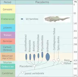 Giles, Sam; Friedman, Matt; Brazeau, Martin D. (2015-01-12). "Osteichthyan-like cranial conditions in an Early Devonian stem gnathostome". Nature. 520 (7545): 82–85. Bibcode:2015Natur.520...82G. doi:10.1038/nature14065. ISSN 1476-4687. PMC 5536226. PMID 25581798. - ↑ Zhu, Min; Ahlberg, Per E.; Pan, Zhaohui; Zhu, Youan; Qiao, Tuo; Zhao, Wenjin; Jia, Liantao; Lu, Jing (21 October 2016). "A Silurian maxillate placoderm illuminates jaw evolution". Science. 354 (6310): 334–336. Bibcode:2016Sci...354..334Z. doi:10.1126/science.aah3764. PMID 27846567. S2CID 45922669.