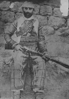 In April 1915 the Assyrian nation, led by its main tribal chiefs of Bit-Jilu, Bit-Bazi, Bit-Tyari, Bit-Tkhuma, Bit-Shamasha, Bit-Eshtazin, Bit-Nochiya and Bit-Diz "took arms against the Turks at the request of the Russians and British."[28] Over the summer of 1915 they successfully held off the far larger Ottoman army and 10,000 Kurdish militia and tribal forces fighting with the Ottomans. The Ottomans, unable to break the Assyrians, then brought in heavy artillery and ammunition that, together with an overwhelming advantage in numbers and supplies, eventually overwhelmed the lightly armed and outnumbered Assyrians. The Russian Army Corps had promised reinforcements, which came too late, leading most of the population of the tribes and districts of JILU, Baz, Tyari, Tkhuma, Tergawar, Mergawar, Bohtan, Barwari, Amadia and Seert to be massacred, including women, children and the elderly. Churches and monasteries were destroyed or converted into Mosques, livestock and possessions were stolen by the Turks and Kurds, who then occupied the emptied Assyrian towns, villages and farmsteads.[28] Survivors of fighting age joined the Assyrians of northwest Persia, northern Iraq and northeast Syria, including those from Salamas and Urmia to form an Assyrian army, and had a real prospect of fighting with the Russians to evict the Ottoman forces from Persia, and historic Assyria. The Assyrians, under such leaders as Agha Petros and Malik Khoshaba, scored a number of victories over the Ottoman and Kurdish forces despite overwhelming odds during this period, until the Russian Revolution of 1917 dissolved the Russian army.